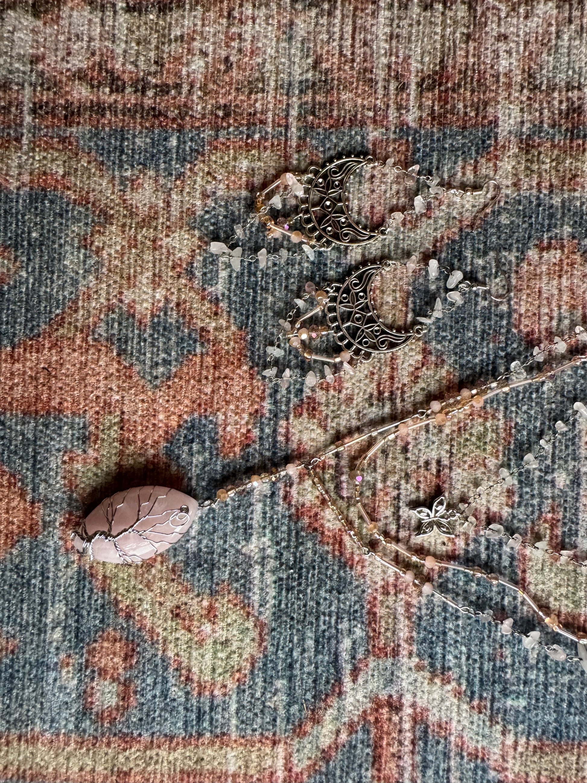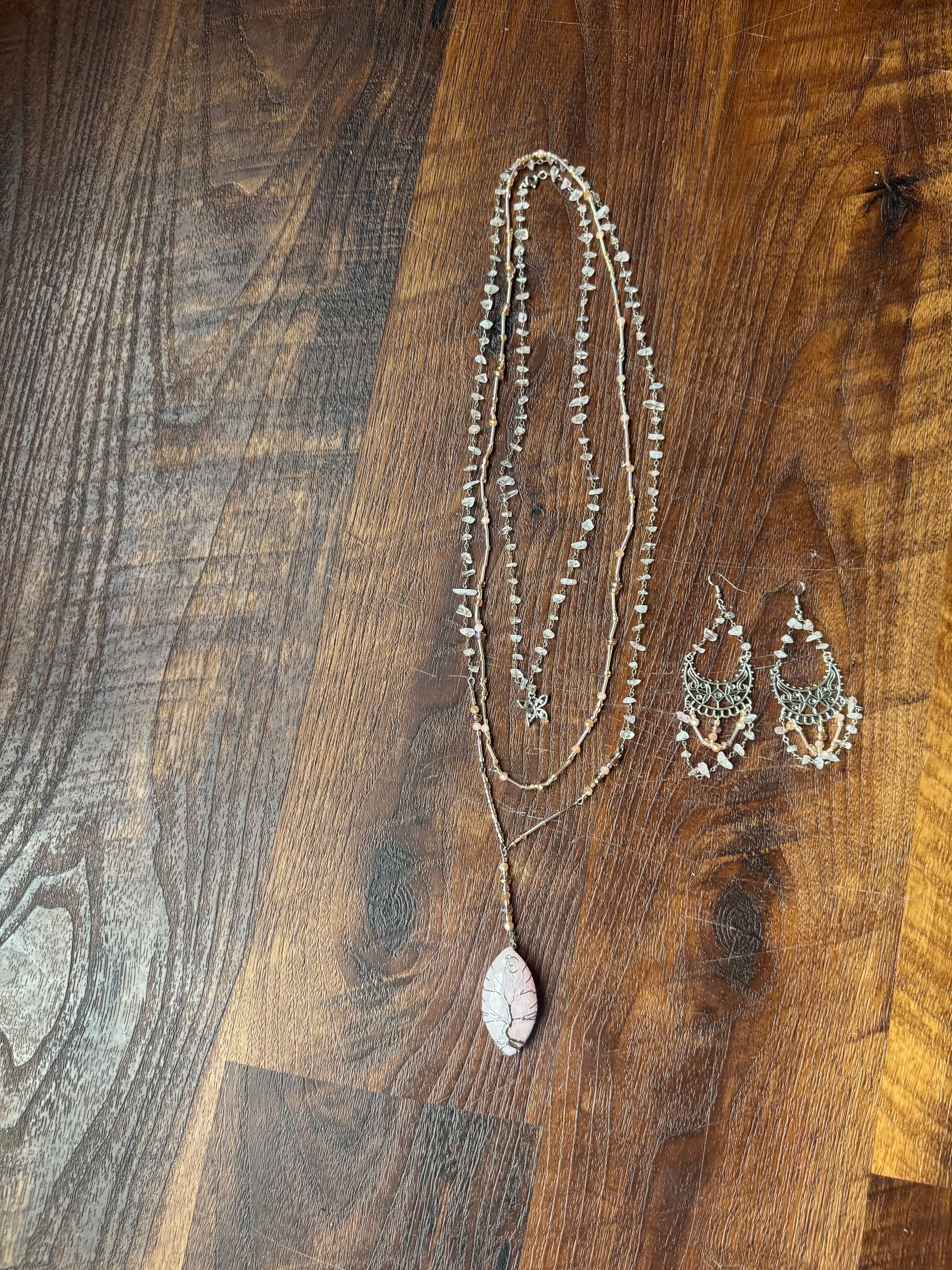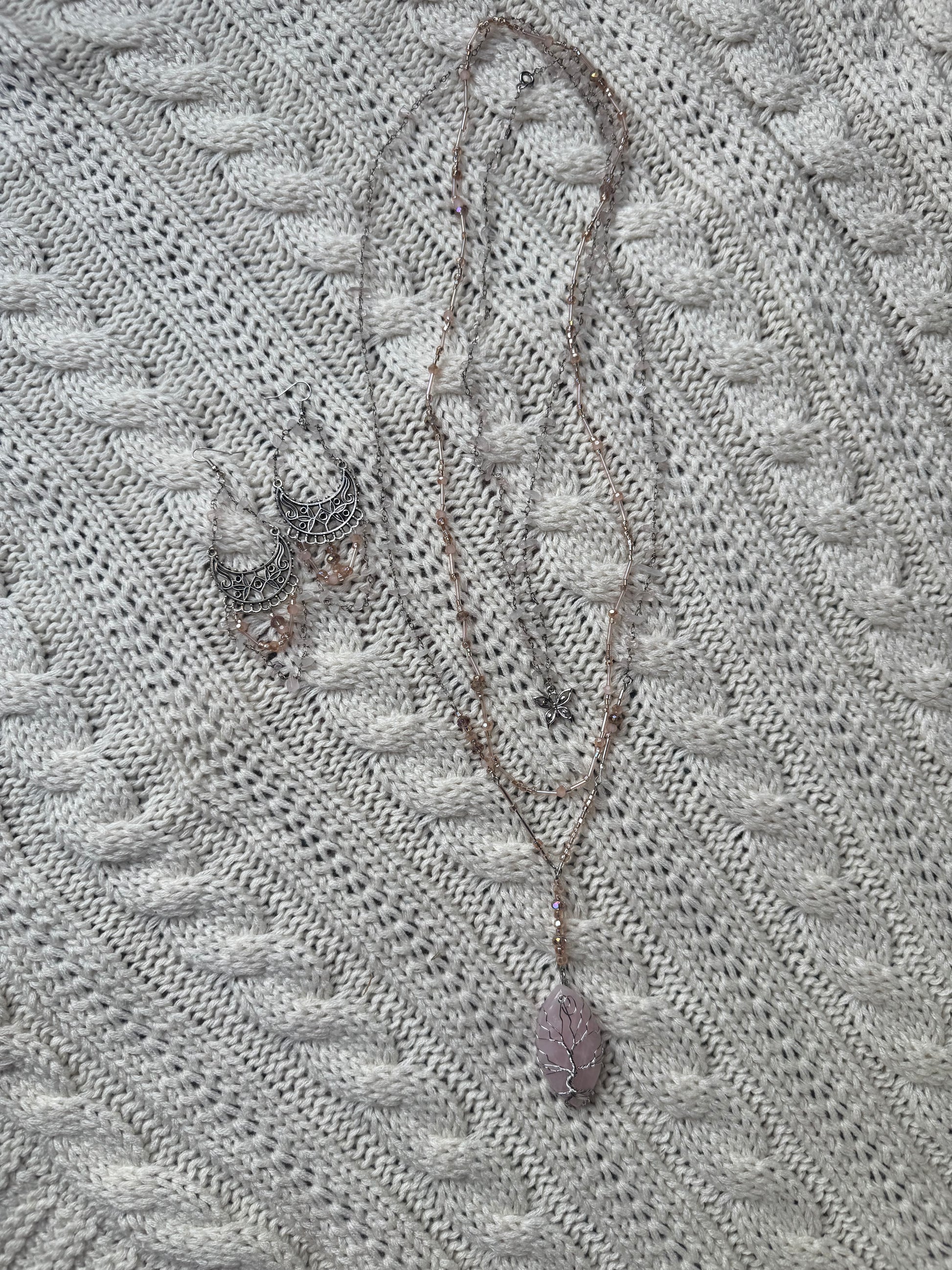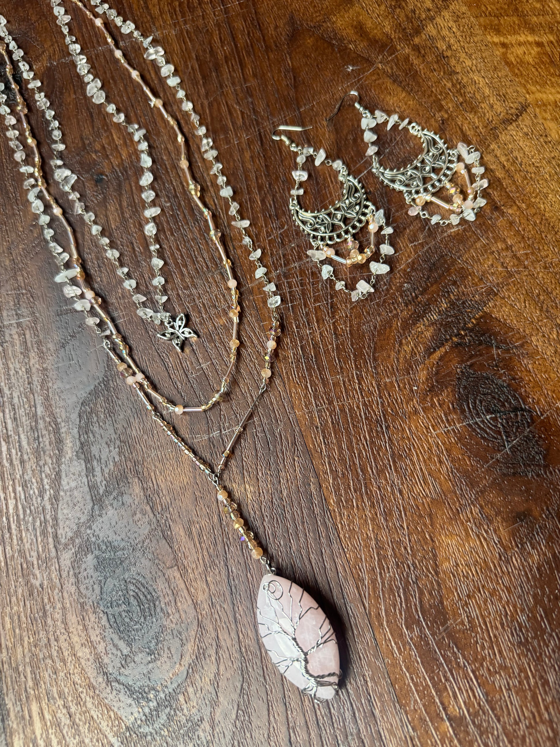 Fall in love with the gentle energy of rose quartz š This handmade 4-piece set includes layered beaded necklaces, a wire-wrapped pendant, and dreamy chandelier earrings ā all designed to elevate your vibe and your look. One-of-a-kind, just like you āØ
